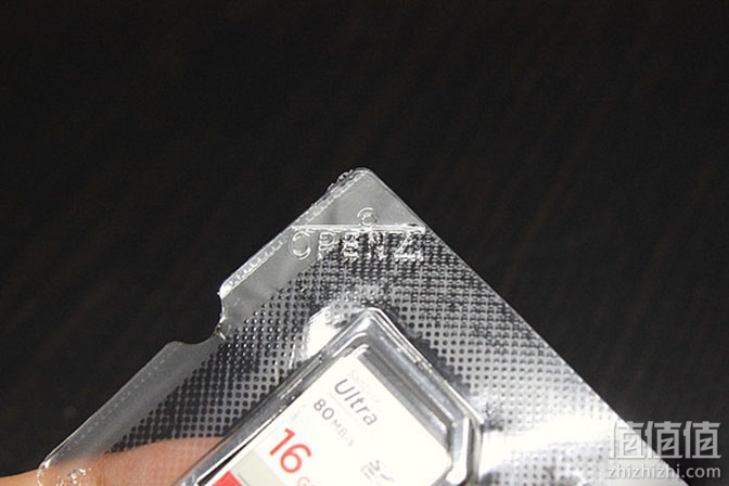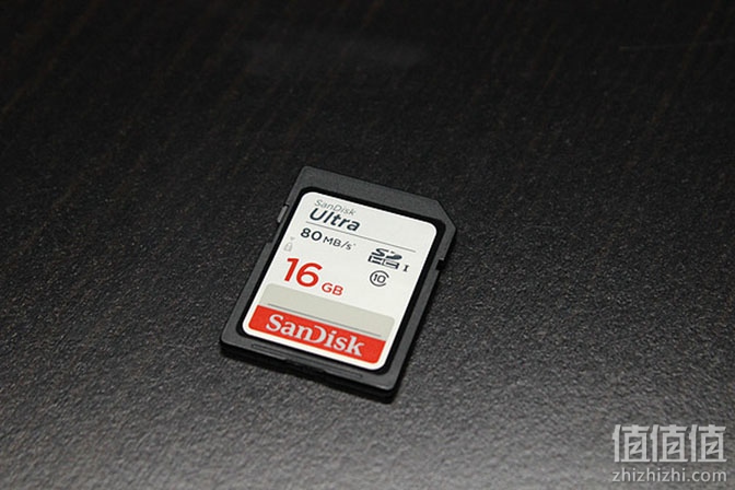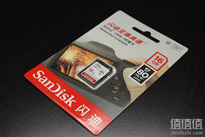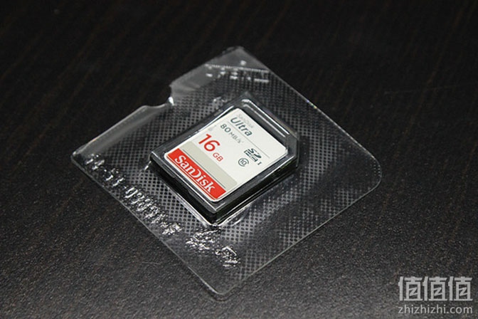 ▼闪迪SD卡的名字还是非常霸气的,至尊高速!包装比较一般,顶部白色、底部红色,中间印了一个相机的彩印。左边标明了16GB的容量和80MB/s的读取速度,中间是透明窗,可以看到里面白色的SD卡