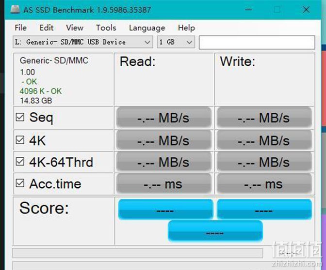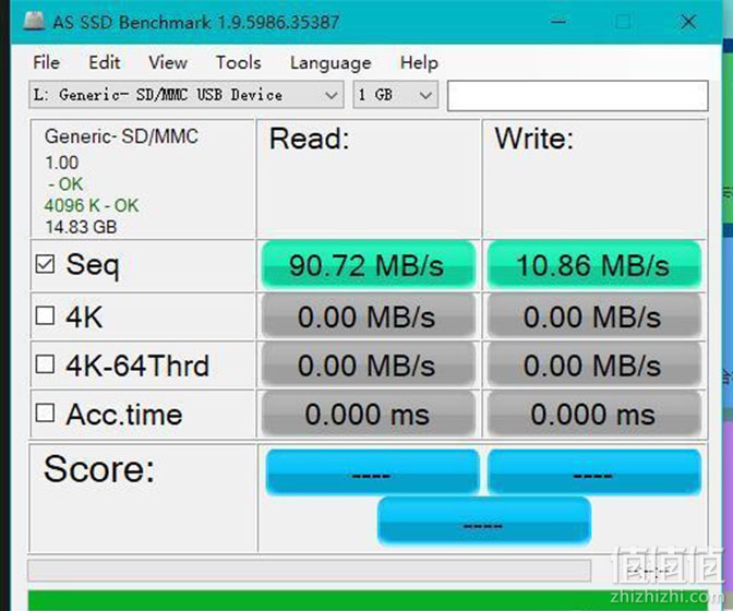 ▼使用川宇USB3.0读卡器插入电脑,打开AS SSD,左上角显示两个OK,容量是14.83GB
