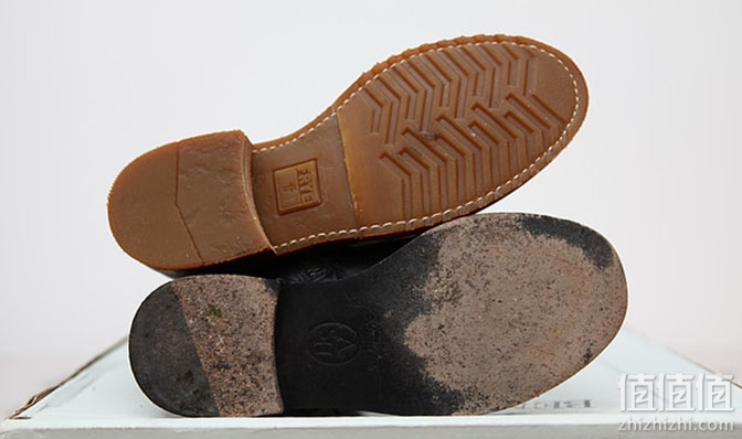 接下来出场的是鞋底对比图,ash我买的是35码,大家可以看出Frye5.5码,不会比ash的35码大很多,另外两双鞋的鞋底都是皮底,ash的皮底没有贴膜,大家可以看到这双鞋被磨成这个凄惨的样子其实真正穿的没几天,因为我是公交+走路上班族,因此不适合穿这样的皮底吧,不耐磨,有建议说每天走步超过5000步的mm不要买皮底。也有人说买了皮底贴膜啊,可是,那样就体验不到皮底的感觉了。而再看Frye的鞋底是在前一篇介绍的皮—橡胶—皮—橡胶这样的结构,保证了耐磨性和舒适性。