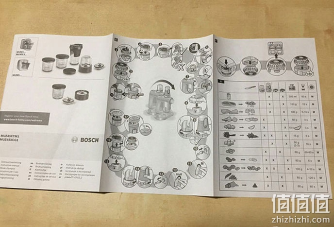 说明书有安装细节和两个刀头各自标注可以处理的食物表格。