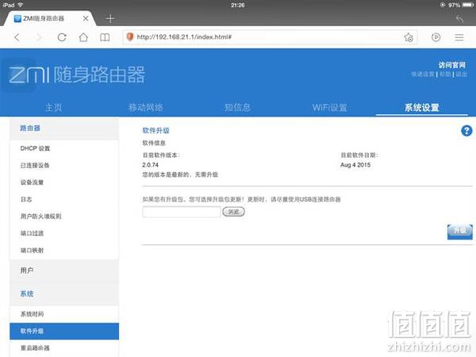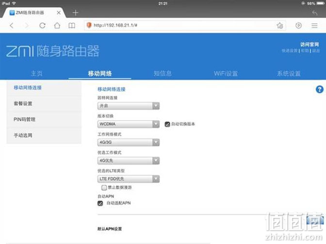 如果是台式机、笔记本可以在浏览器从192.168.21.1访问路由器后台,密码还是zimifi。