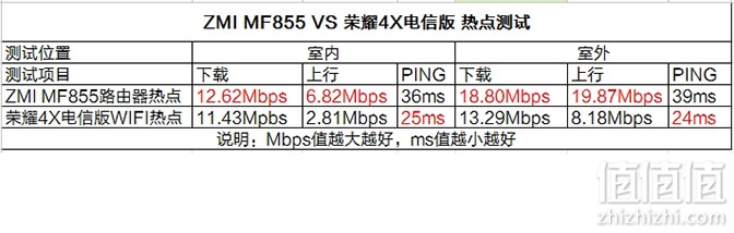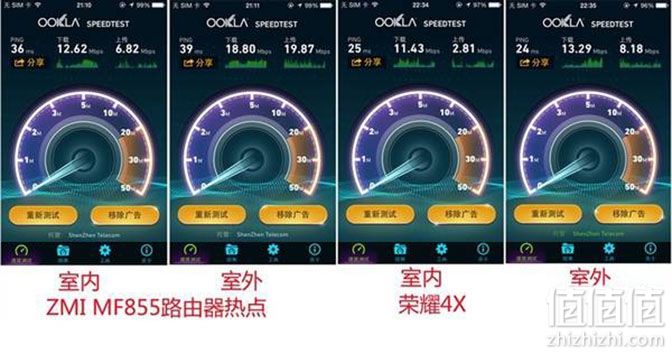 测试结果,ZMI MF855路由热点,在室内的下载和上传分别是12.62Mbps、6.82Mbps,PING延迟36ms;室外的下载和上传分别是 18.80Mbps、19.87Mbps,PING延迟39ms。荣耀4X电信版Wi-Fi热点,室内的下载11.43Mbps,上传 2.81Mbps,PING延迟25ms;室外的下载13.29Mbps,上传8.18Mbps,PING延迟24ms。