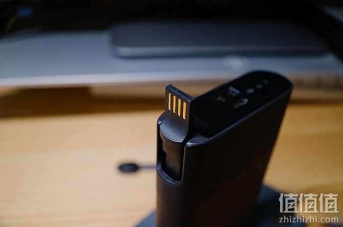 顶部侧面是磁性收纳的USB充电线,长度略短,但考虑到出门可以少带一圈数据线,这个设计还是值得点赞。