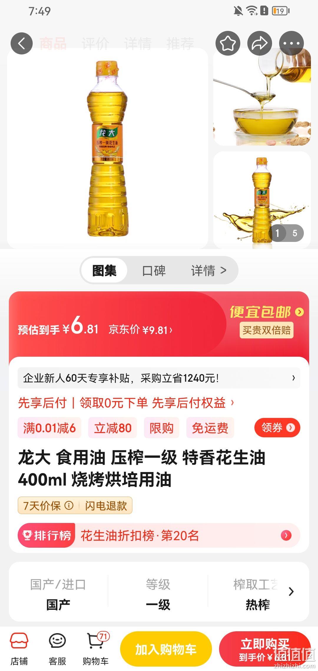 再降价、PLUS会员: 刀唛(Knife)【保真花生油】花生油6.18L 臻原香物理压榨一级精炼食用油109.9元,凑单后99.98元京东商城 44 分前