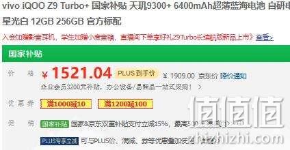 ++-- 网购值值值温馨提示: 优惠价会停止,请赶快去买。假如您点击到京东商城商品页面显示价格已改变,那可能就是折扣价失效。 --++iQOO Z9 Turbo 于9月24日发布。共有月影钛、星芒白、曜夜黑三款配色可选。配备“星轨纹理”及等深四曲直边中框,正面采用了一块华星至新6.78英寸C8材料防频闪护眼屏,1.5K分辨率,144Hz刷新率,支持DC调光,亮度至高4500尼特。整机重196g,机身薄至7.98mm,支持 IP65 等级抗水防溅。 性能方面,搭载天玑 9300 处理器 LPDDR5X UFS 4.0性能铁三角,搭配Q1电竞芯片,支持多款游戏影音应用超分超帧。拥有6043mm?超大面积VC均热板,游戏体验更畅快。内置6400mAh超薄蓝海电池,支持80W 快速充电及反向充电。 影像方面,后置5000万像素主摄镜头(光喻LYT-600、OIS、f/1.79) 800万像素超广角镜头,前置1600万像素镜头,内置NICE影像算法,拍照更出片。 其他方面,支持5.5G通讯网络,支持Wi-Fi 7网络协议,支持双频GPS、四频北斗,运行OriginOS 4系统。