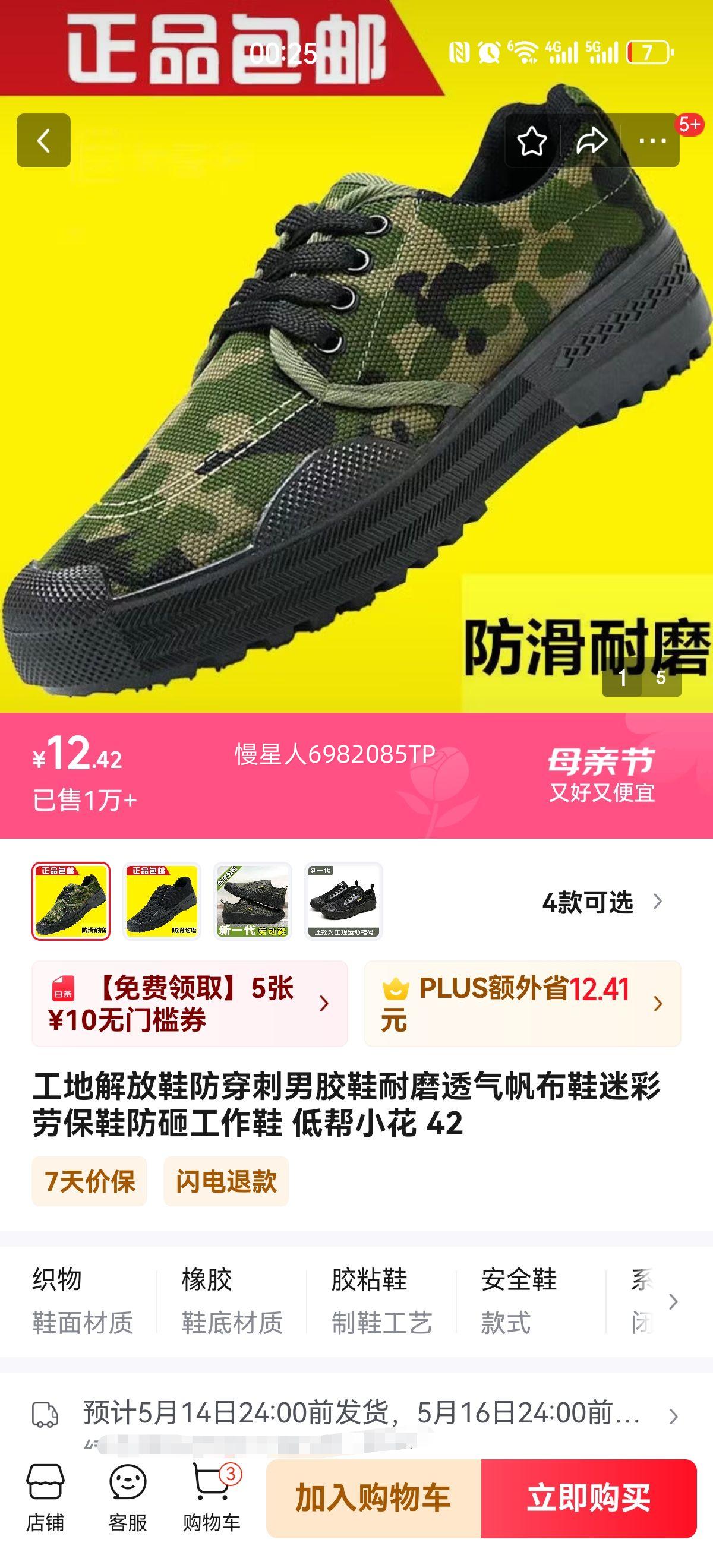 工地解放鞋防穿刺男胶鞋耐磨透气帆布鞋迷彩劳保鞋防砸工作鞋 低帮小花 42