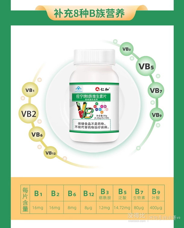 8种B族营养素黄金配比,增强抵抗力,护脑抗疲劳,护肝解压力,远离亚健康。目前基础款100粒某猫商城久众旗舰店售价¥59.9,领取¥49优惠券,APP端下单首先加购,再打开淘宝APP首页-淘金币(找不到就搜索“淘金币”),进入淘金币活动页面-我的足迹-前排找到商品点进去, 再次加购1件,淘金币可抵2.99元,实付新低¥7.91包邮,加强款60粒装同价。 维生素B也称维他命B,是B族维生素的总称,它们常常来自于相同的食物来源,如酵母等。维生素B是身体内新陈代谢必需的一环,每种维生素B都参与了关键的代谢反应,通常以辅酶的形式存在。维生素B族的主要作用有帮助糖类、脂肪、蛋白质代谢以释放出能量,制造血液所需的营养素,能量代谢的重要酶等,是人体不可缺少的维生素。这款仁和 佐宁牌 B族维生素片,每片含16mg维生素B1、16mg维生素B2、8mg维生素B6、8μg维生素B12、12mg维生素B3烟酰胺、14.72维生素B5泛酸、80μg维生素B7生物素、400μg维生素B9叶酸,解压抗皱,滋养肌肤。规格: 0.35g/片×100片,每日用量::每日1次,每次1片。 ++-- 温馨提醒 * 活动价会逾期,请尽快冲。要是您点击到天猫活动链接显示标价变化,就意味着折扣价已结束了 --++ 及时获取没得比最新优惠信息和海淘代购信息,请添加微信【mdb_2024】