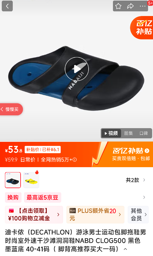 迪卡侬(DECATHLON)游泳男士运动包脚拖鞋男时尚室外速干沙滩洞洞鞋NABD CLOG500 黑色 墨蓝底 40-41码( 脚背高推荐买大一码)
