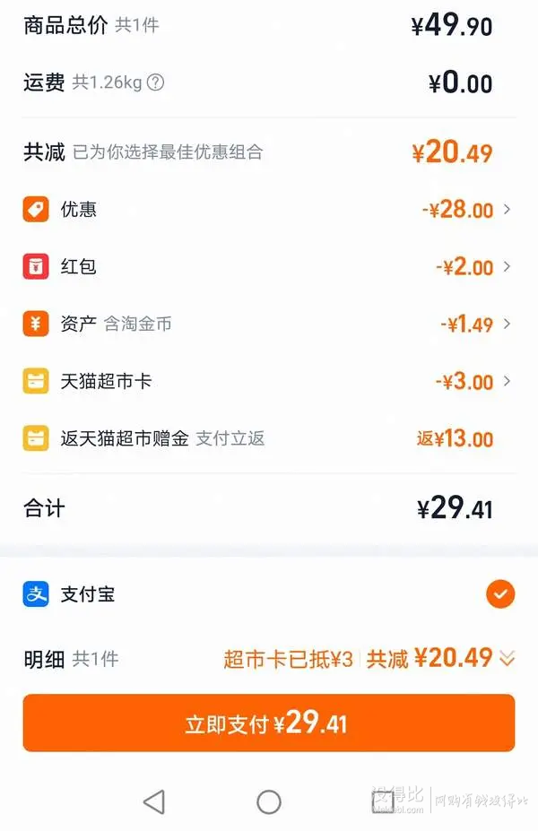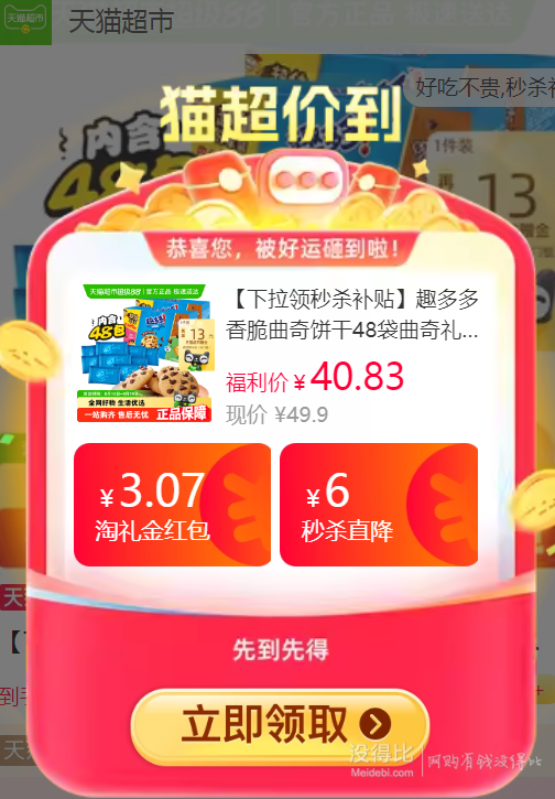 以往低价都要24块多,白菜价速抢,没有娃可以拒绝趣多多!目前某猫超市售价49.9,红包抵2元,某猫超市首页搜“奥利奥”领取3元品牌金(猫超卡结算直接抵扣),商品页面右上角进入直播间加购1件补贴4元,下拉至详情页点击“淘宝秒杀限时疯抢”图片跳转加购1件直降10元,淘金币抵1.49元,进入购物车将数量改为1件,进入结算页面,返13元超市卡,返卡后实付到手新低16.41元包邮白菜价!++-- 网购值值值请您注意:优惠会过期,请迅速去买. 要是您点击天猫详情页面看见价格还是原价, 说明活动价完结. --++