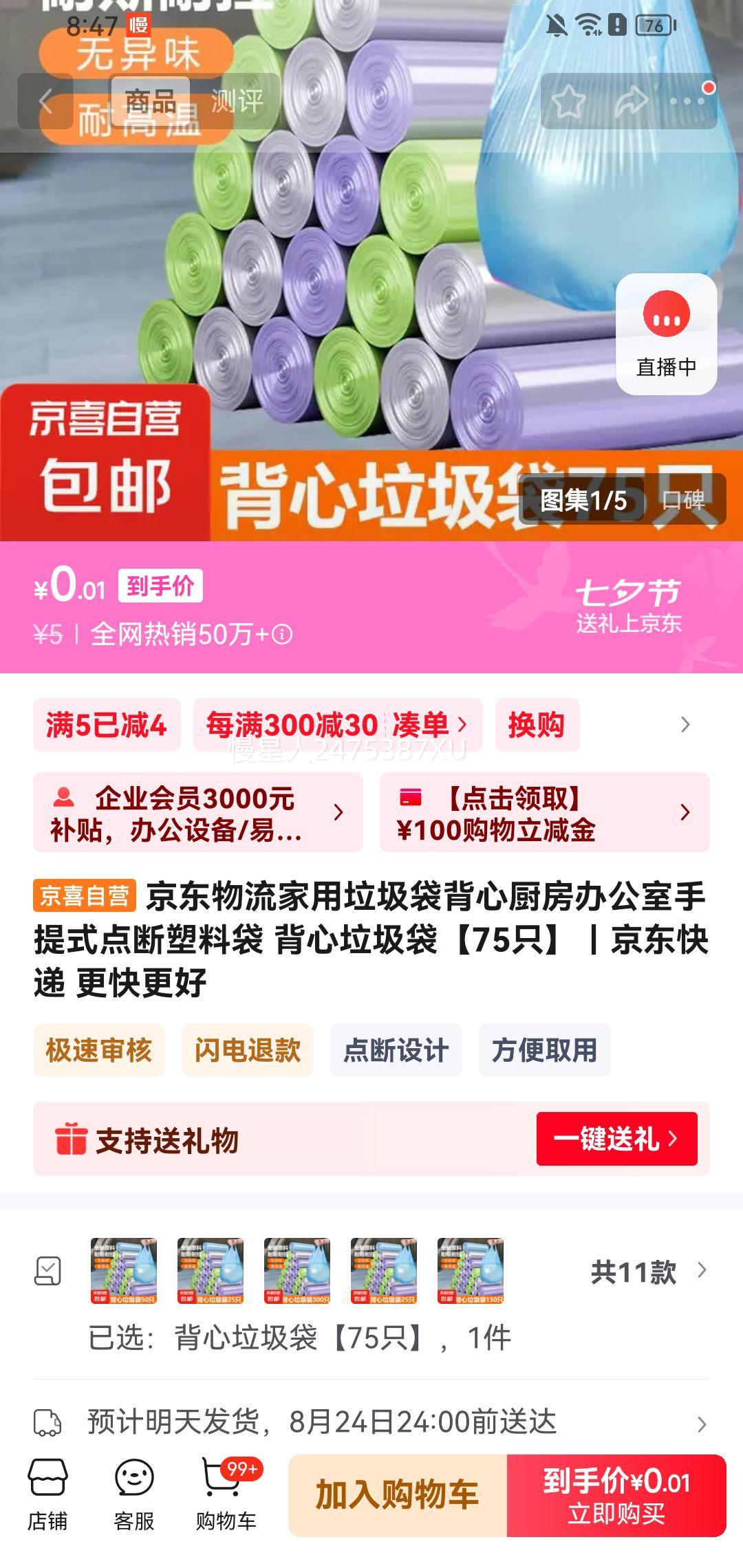 京东 背心垃圾袋75只