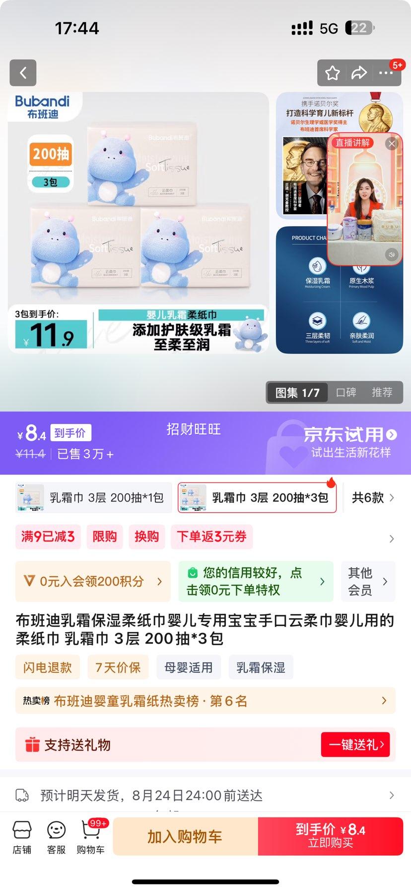 布班迪乳霜保湿柔纸巾婴儿专用宝宝手口云柔巾婴儿用的柔纸巾 乳霜巾 3层 200抽*3包