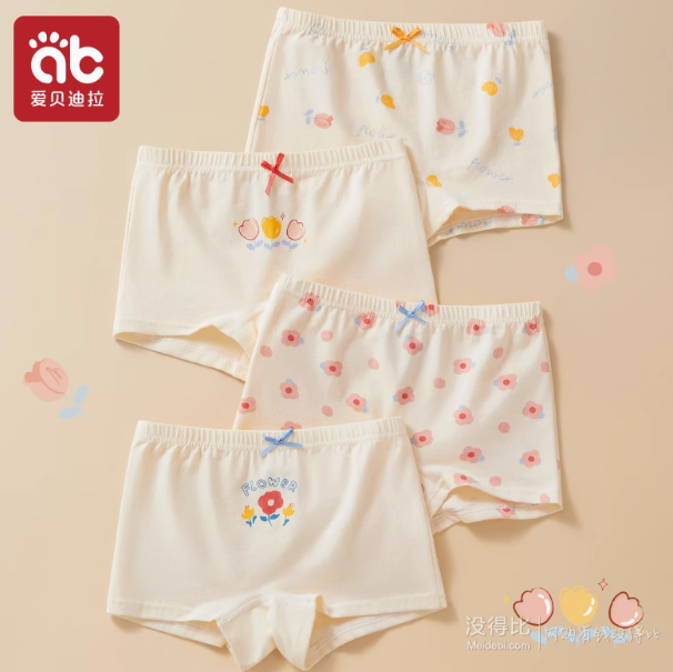 爱贝迪拉 女童纯棉平角内裤4条,新疆精梳棉面料,舒适透气,弹力贴身;不含荧光剂,符合婴幼儿A类标准;扁头加宽松紧腰头,贴身有弹力,双线工艺脚口,穿着不卷边;升级眼透气抗菌内裆,安心舒适。