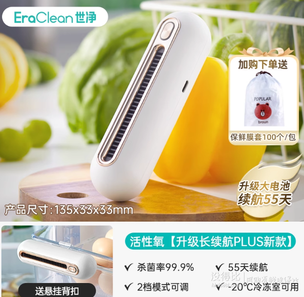 这款小米有品 Eraclean 世净 CW-B01/CW-B02 冰箱空气净化器,专为冰箱除味杀菌设计,本质是个臭氧杀菌器,而且永久无需更换耗材,使用方便,配备挂钩设计,可关于冰箱门格上使用,不占位,同时增加了整体空间的流通循环,更均匀,无死角,一键触控,科学释放臭氧离子,主动歼灭细菌分子,高效除菌,双模式消毒,一档:双击深度除味消毒模式,二档:长按2秒保鲜除味消毒模式,经广微测检测,杀菌率高达99.9%,防冻防潮设计,即时温度低至零下30℃也能正常工作。内置800mAh电池,充电约2小时,深度除味消毒模式续航时间约72h,保鲜除味消毒模式续航时间约30天。除了冰箱除味,也可用于鞋柜、衣柜、房间净味及玩具消毒,一物多用。