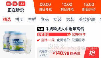 目前天猫国际自营全球超级店售价¥237,下拉至详情页点击淘宝秒杀限时疯抢,直降¥88.6,88会员95折,实付¥140.98包邮,折¥70.49/罐。