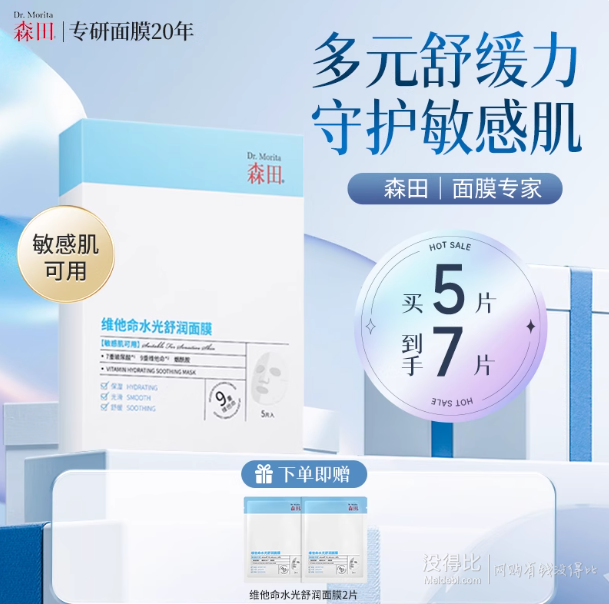 目前某猫商城森田官方旗舰店买5片赠2片到手7片装售价¥39.9,下单立减叠加可领¥18优惠券,APP端下单首先加购,再打开淘宝APP首页-淘金币(找不到就搜索“淘金币”),进入淘金币活动页面-我的足迹-前排找到商品点进去,淘金币可抵1.19元,实付¥15.91包邮。 特有脂质体包裹技术,7+9复配增效,补水舒缓双管齐下;7重透明质酸,缓解肌肤干燥,增强保湿效果;9种维他命配方,多元呵护,守护敏感肌。 ++-- 注意: 特价会逾期,请尽快下单. 如您点击到天猫详情网页看到价格变化,那就是优惠价已过有效期. --++