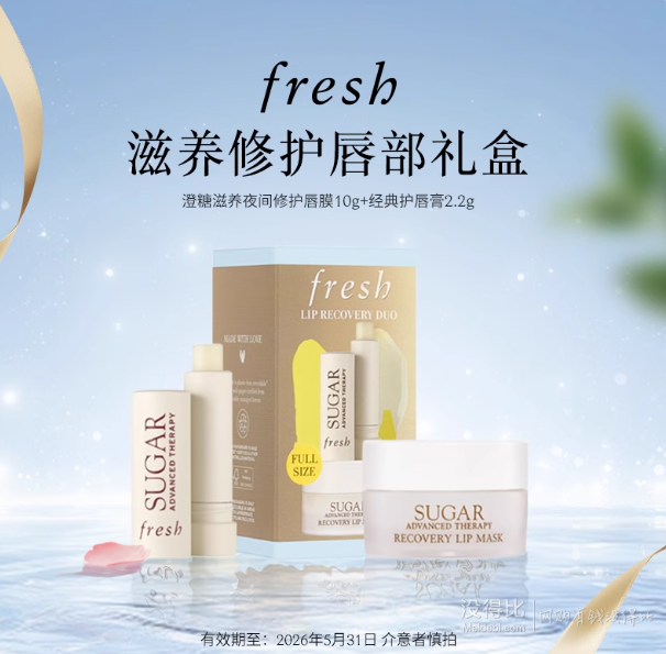 旗舰店出品,日常护理必备,目前某猫Fresh馥蕾诗官方旗舰店售价¥387,可领¥271券,叠加88会员200-20元消费券,凑单1件(可T),实付¥104.4包邮,本批次临期至2026年5月31日,用完无压力,入手好价。 fresh 馥蕾诗是属于LVMH旗下的高端品牌,fresh 馥蕾诗 滋养修护唇部礼盒,包含:澄糖滋养修护润唇膏2.2g+保湿修护唇膜6g ,这款澄糖滋润护唇膏,突破性修复配方能显著改善唇部润泽度,增加唇部肌肤含水量,丰盈唇部,明晰线条,在唇部形成保湿膜,让双唇长时间水润,唇妆前使用双唇更滋润显色更饱满。 ++-- 网购值值值请您注意:折扣价会过期, 请尽快买之. 若是您点击天猫商品页面发现标价已变,那就说明特卖过期. --++