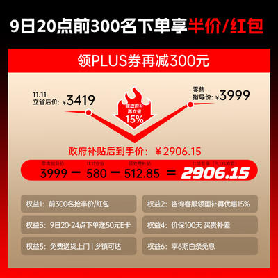 可用券及活动:15%起减500元、满2999元减580元、plus会员券下单立减、plus会员下单立减、大促神券满0.01-100
