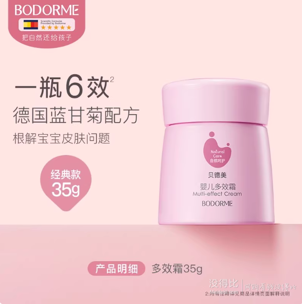 30年专注宝宝肌肤护理,北半球慢慢降温了,这款多效霜能满足换季的肌肤需求,呵护宝宝娇嫩肌肤。目前35g*2件规格某猫商城贝德美旗舰店售价¥74,领取¥53-35优惠券,商品页面右上角点开“…”-最下面一行选择“淘金币”打开进入-中间“我的足迹”-找到该商品后下单淘金币抵扣¥2.96,2件实付¥36.04包邮,折¥18.02/瓶。 Bodcrme 贝德美 婴儿多效霜 ,德国蓝甘菊配方,1瓶6效,补水滋养娇嫩肌肤,防御皲裂,强化脆弱肤质,舒缓红痒,缓解宝宝湿疹,深度保湿。 ++-- 注意事项 * 优惠价会过期,请加紧去买。要是您访问天猫活动网址看见标价已恢复原价,就意味着优惠价已结束。 --++