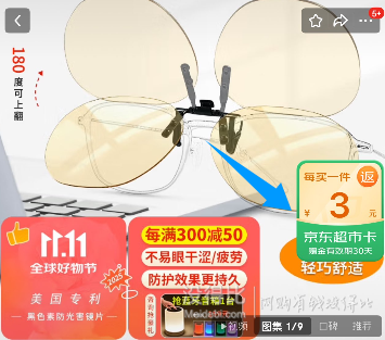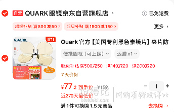 美国专利黑色素镜片,180°随意上翻,仅重9g,贴合度好,适合市面上大部分镜架款型。目前这款眼镜夹片某东商城自营旗舰店售价¥159,满149减20元,可叠加¥30优惠券,叠加满200-20元惊喜红包,可领满1元9折红包券(200-20超级惊喜红包膨胀之后有一张满1元9折惊喜红包),凑单凑单品,下单返3元超市卡,plus会员实付新低¥74.2包邮白菜价!2款可选! ++-- 请您注意 * 促销有时效, 请加紧购买. 假若您点到京东详情网页发现标价已恢复,那可能就是促销完结. --++