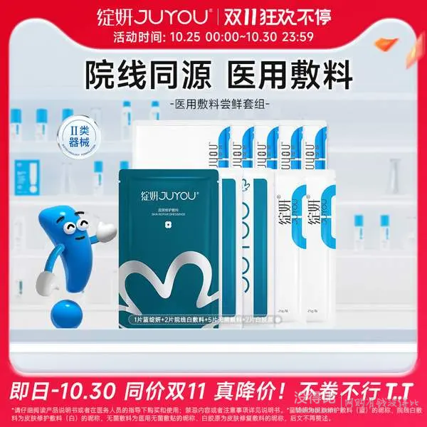 目前某猫商城绽妍官方旗舰店10片组合售价¥ 300,立减¥162,叠加领取¥86优惠券,实付¥52包邮,三款组合可选。 国内超2千家公立医院皮肤科医生推荐,专注于皮肤屏障修护的专业品牌。院线同款,二类器械,孕妇可用医用面膜,无激素无依赖性,不刺激不过敏。 JUYOU 绽妍 皮肤修复敷料,三重透明质酸黄金复配,基底维稳,敏感修护,补水保湿三管齐下。大分子HA,有较好的成膜性,可有效隔离过敏源等外界刺激。小分子HA,促进细胞迁移,修护组织损伤皮炎的日常护理。寡聚HA,分子量极小,直达基底,根源成网补水修护,持久保湿。优选铜氨天丝混纺膜布,质地如云朵般轻盈绵密,柔软亲肤,更水润服帖。适用于面部激光、光子嫩肤、微晶磨削、果酸活肤术等术后创伤皮肤的保护和护理。适用于皮肤湿疹、敏感性皮肤、激素依赖性皮炎等屏障受损皮肤的保护和护理。++-- 温馨提示: 好价格有时效, 请赶紧下单。假如您点击天猫详情链接发现标价改变, 就意味着打折完结。 --++