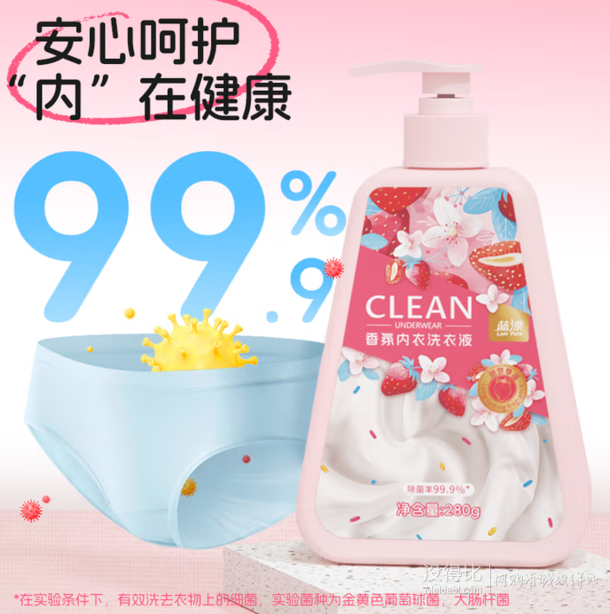 目前280g*3瓶某东商城蓝漂清洁旗舰店售价¥9.99,叠加¥3优惠券,实付¥6.99包邮。 内衣裤专洗,多重清洁因子,温和低泡,柔顺去渍,除菌率99%,草莓奶香+甜心樱桃香,留香去味,全家可用。 ++-- 温馨提示 * 折扣有时效,请速度买之。假如您访问京东商品网址看到价格变化,那说明促销已失效了。 --++
