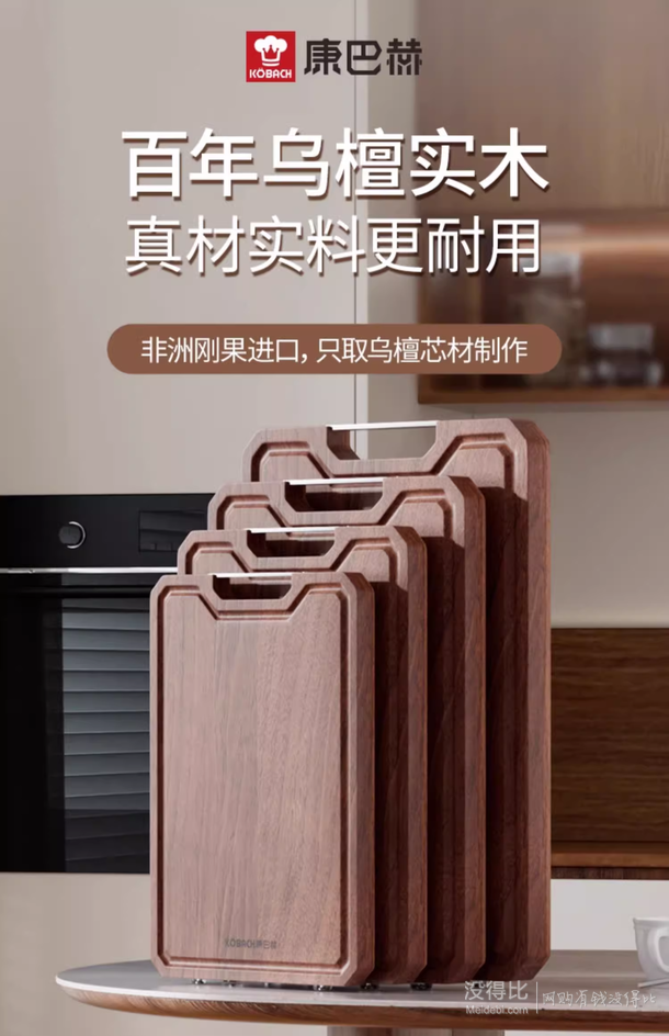 康巴赫 乌檀木抗菌防霉家用菜板砧板 ,非洲刚果进口乌檀木,抗菌率≥99%,Smart感应烘干技术,不易变形、起屑不易开裂,不易发霉,不变形起屑;双面可用,生熟分切,避免细菌交叉感染;加深锁水导流槽,防止汁水外流,保持台面整洁;缎光不锈钢提手,握感舒适,方便收纳。