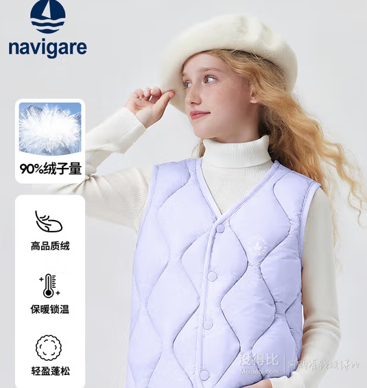 轻羽绒,90%绒子含量,蓬松柔软,轻量面料,不惧水污。目前某东商城NAVIGARE童装旗舰店售价199元,领取130元优惠券,实付低至69元包邮,10色可选,120-160cm码全。 Navigare 意大利小帆船 儿童90绒子羽绒马甲WGNVG24805A,采用空气轻量感面料,内里90%鸭绒填充,1000+清洁度,蓬度700+,轻薄保暖。轻羽绒,轻暖无负担,空气轻量感面料(比1个苹果轻!) Navigare(纳维凯尔)于1961年创立于意大利,作为世界知名的海洋风格品牌,一直秉承海洋休闲的设计理念,坚持享受生命,享受陌生,尽享自由和乐趣。在全球35个国家和地区经营着navigare品牌产品销售。 ++-- 网购提示 - 降价会过期, 请赶快动手。如果您点击到京东商家网页显示价格已变化, 那可能就是好价结束. --++