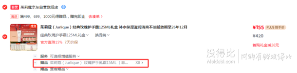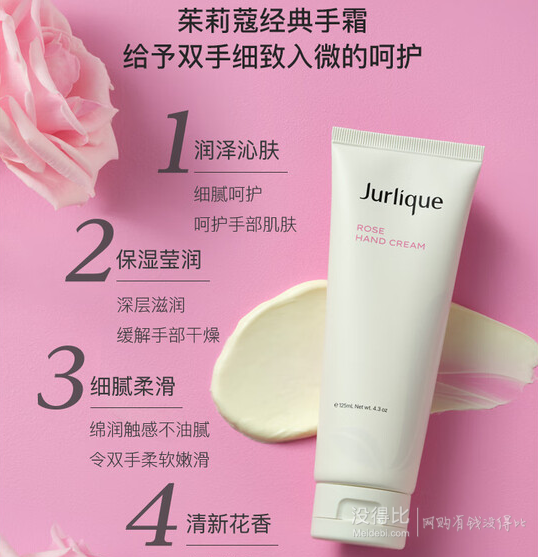 以往这个礼盒最低279,日常买15ml小样低价都要15元以上!目前某东售价420元,可领300-50元优惠券,1000-150元优惠券,和1件9折PLUS补贴券,加凑单品一起下单(下单后可T),实付新低155元包邮,包括125ml正装和15ml*8个小样!按以往低价计算,起码需要240元以上! ++-- 值值值提醒您 - 折扣会失效,请尽早去买。假如您点击京东活动链接看到标价已改变,那说明特价逾期. --++Jurlique 茱莉蔻被称为地球上最纯净的护肤品,凭借其天然精纯的品质名闻天下。玫瑰护手霜是jurlique最知名的明星产品,蕴含玫瑰、金盏花等天然力量,能深入保湿、滋润及保护肌肤,令双手回复柔软幼滑。非油腻性,可深层滋养皮肤、容易吸收,使双手恢复柔软,并保持其弹性和细致。对于干燥和龟裂的表皮提供一层保护膜。帮助舒缓皮肤炎和湿疹。味道自然芬芳,内含玫瑰精油;绝不含任何香料。
