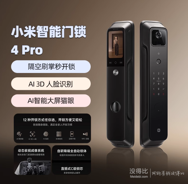 今年刚上市的新款,功能全面,以往低价1700+!目前某猫售价3199元,可领461元优惠券,详情页可领取囯补85折,详情页右上角点“...”-淘金币-足迹加抵-加购物车,淘金币可抵扣161.99元,到货后还可晒单返 30元,实付新低1476.81元包邮白菜价! 小米最新推出的智能门锁4Pro,集12种解锁方式(含AI 掌静脉识别、AI 3D 人脸识别I)、智能大屏猫眼、多重安全告警等核心功能于一身,隔空挥掌秒开门,全家老小都适用。AI 掌静脉识别是这款门锁的一大亮点。不同于指纹容易磨损或脏污影响识别,它通过近红外光扫描手掌静脉血管特征,无需接触门锁,抬手就能秒开。老人指纹浅、小孩身高不够、手指沾水或脏污时,这种无接触识别更显优势,实测拒真率不到1%、误识率低于0.001%,安全性有保障。3D人脸识别则彻底解放双手。走到门前自动识别,身高覆盖1.2米到2米,小孩不用踮脚、成人不用弯腰,暗光环境也能精准捕捉动态;配合活体检测,照片、视频无法破解,金融级安全认证让独居用户更安心。此外,还有AI指纹、远程开锁、手机蓝牙等12种解锁方式,满足不同场景需求。门锁搭载了新一代智能猫眼大屏,24GHz毫米波雷达与AI人形检测算法,门前有人逗留时会自动录像并推送通知。200万像素摄像头搭配152°超广角镜头,可清晰记录楼道动态,3天循环云存储支持随时回看。内门锁配备高清可视屏,访客按铃后自动亮屏,方便老人小孩查看。夜间场景下,4颗补光模组自动切换全彩或黑白夜视模式,确保昏暗楼道中细节清晰可见。日常使用时,我们还可通过手机远程查看门外画面,并支持变声对讲(原声/小丑/大叔音效),独居时更安心。门锁采用干锂电池混合供电:5000mAh锂电池续航约4个月,4节5号干电池作为备用可支撑6个月。电量低于5%时自动切换干电池供电,避免突然断电。门内外均配备Type-C接口,支持应急充电。 ++-- 提示 * 特价会逾期, 请迅速动手. 若您访问天猫商品网址发现标价变化,可能就是折扣已过有效期。 --++