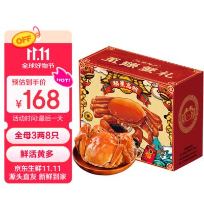 【活蟹】鲜京采 鲜活大闸蟹 公蟹3两 母蟹2两 4对8只 去绳足重 蟹类螃蟹河蟹生鲜礼盒104.9元 (券后省10,月销2000+)京东商城 31 分前