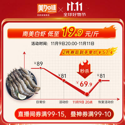 再降价、微信小程序、PLUS:鲜京采 原装进口30/40厄瓜多尔白虾 去冰净重3.3斤 50-66只/盒 *4件233.76元(需领券、需凑单,合58.44元/件)京东商城 5 小时前
