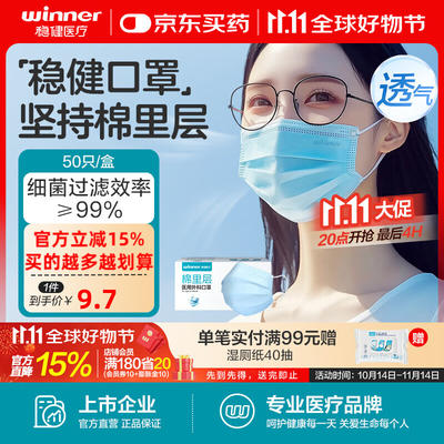 稳健医疗 一次性医用外科口罩 50片 蓝色6.25元京东商城 1 天前